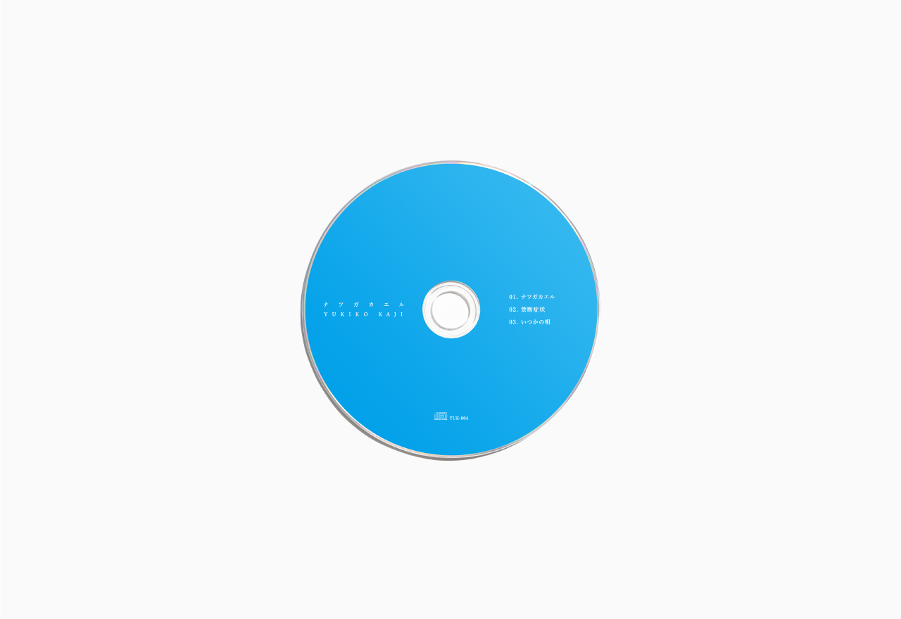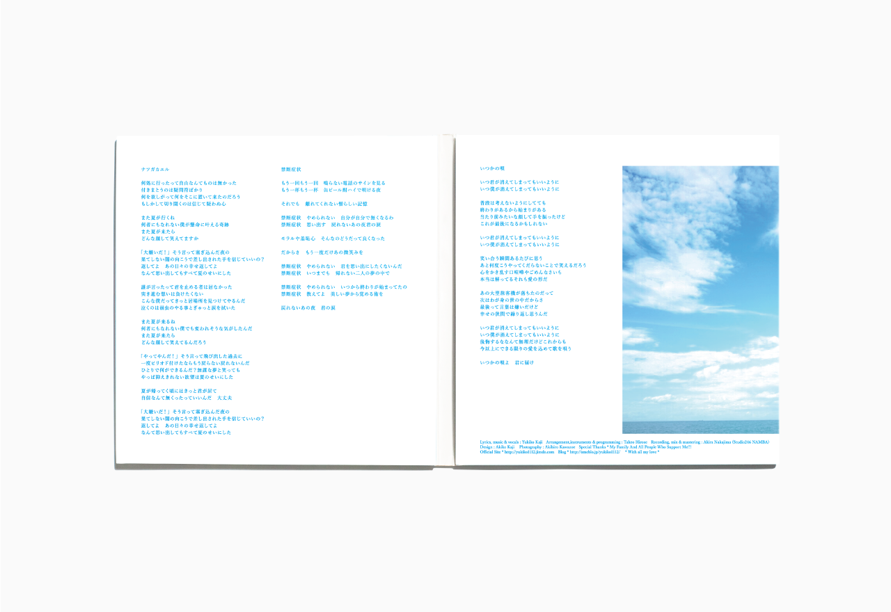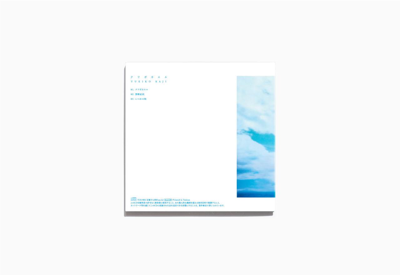 CDシングルのデザイン。夏の空の写真をアーティストに投影することで、これから来る夏、過ぎ去ってゆく夏に思いを馳せる主人公の想いを表現しました。文字・ディスク・アーティストフォト全てをライトブルーで統一し、余白を生かした世界観にすることで、楽曲イメージをストレートに伝えるデザインにしています。